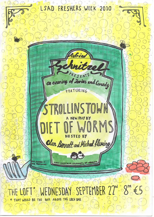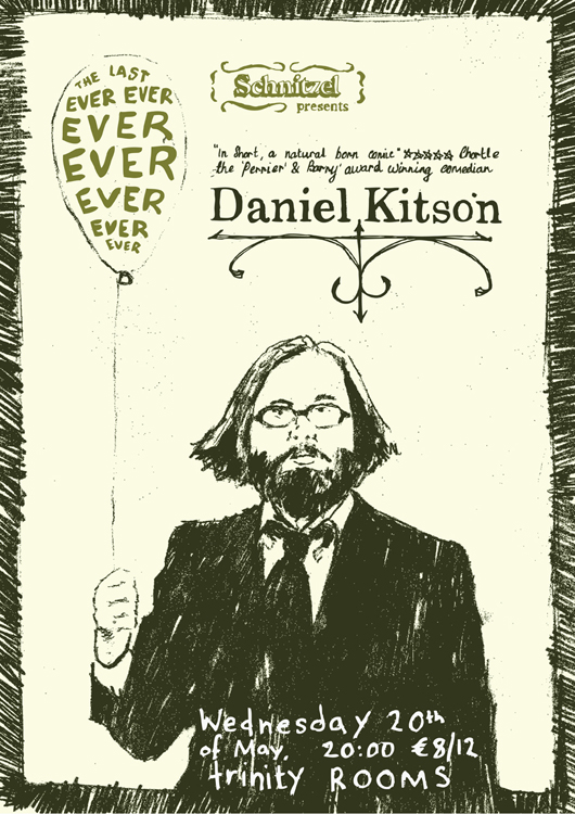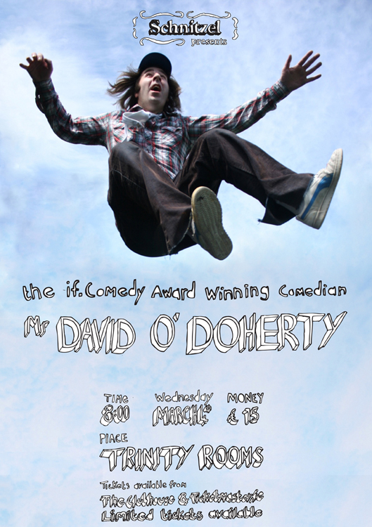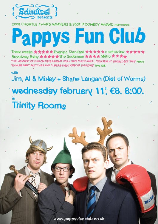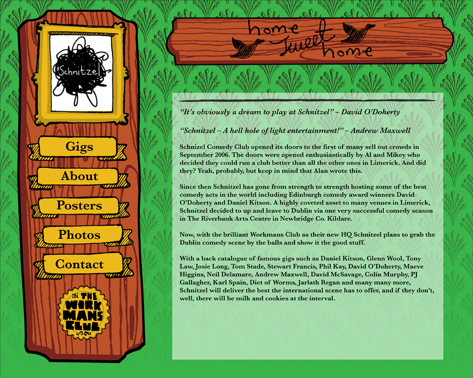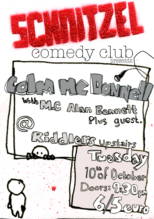 Schnitzel started in 2006 by Alan Bennett and myself, as a student magazine printed entirely on the college photocopiers. It eventually evolved into a comedy club and even briefly a radio show. The comedy club has had over 70 shows in Limerick, Kildare and Dublin. Schnitzel has gone from strength to strength hosting some of the best comedy acts in the world including Edinburgh comedy award winners David O’Doherty and Daniel Kitson. As comedy club Its aim was to a more alternative night of entertainment that didn’t follow the same format as every other comedy club.